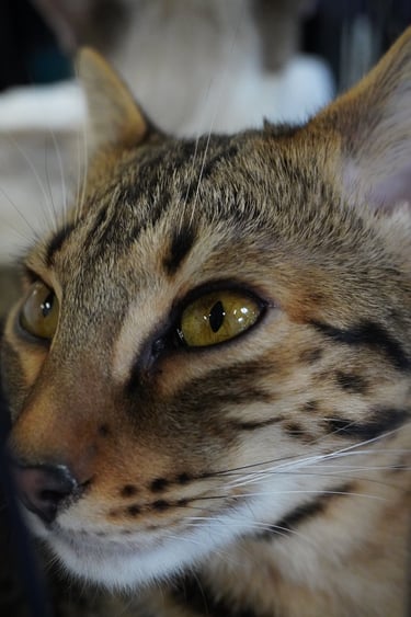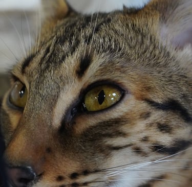 Corpo allungato snello più alto sul posteriore, gambe lunghe, coda non troppo lunga, testa triangolare piccolina rispetto al corpo, orecchie abbastanza lunghe con la particolarità di ocelli (un occhio chiaro quasi al centro dell’orecchio), occhio allungato può essere di svariati colori dal giallo al verde smeraldo, ambrato, blu.